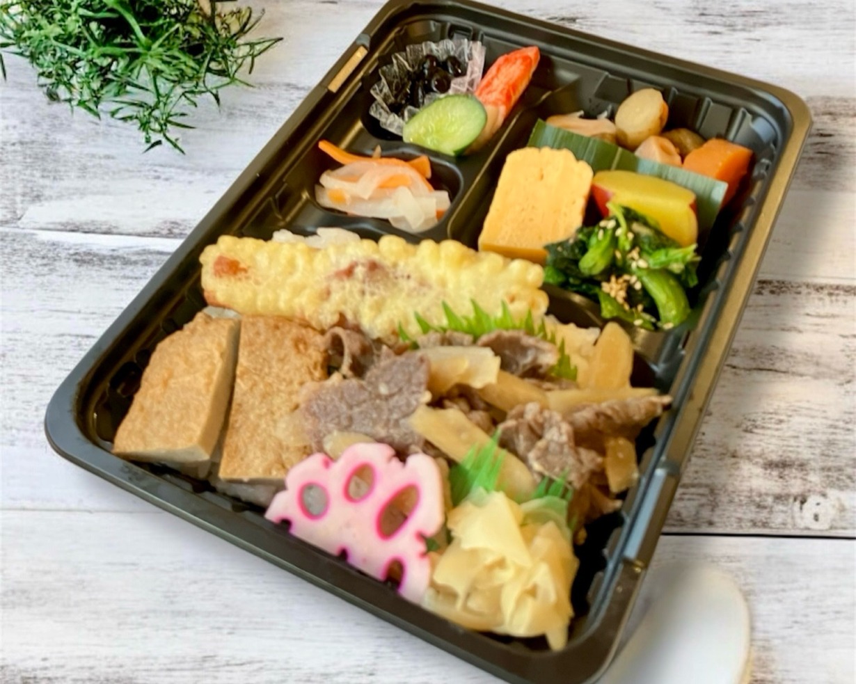 天ぷらと肉料理を中心にまとめた、バランスの良い和風定番弁当。